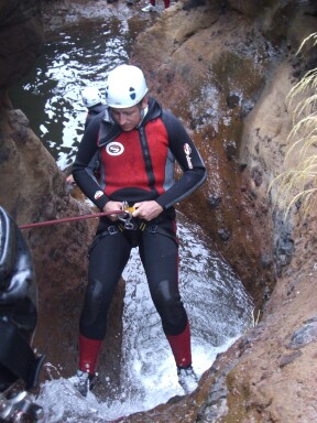 Anyhow...the excursion had to go on...and, despite the burnt landscape (and lingering charred smell in some areas), we committed to enjoying ourselves as much as we'd planned. As soon as we were off the bus, we met our guides---two very nice Madeiran men----who told us to quickly use the bathroom (because we wouldn't be able to again until lunch time!) and then change into helmets, harnesses and full body wetsuits (the air up at that altitude was already kinda chilly...but they warned us that the water we would be experiencing was downright frigid!). The wetsuits & harnesses were hard to get into and NOT very flattering OR comfortable! LOL Judge for yourself: